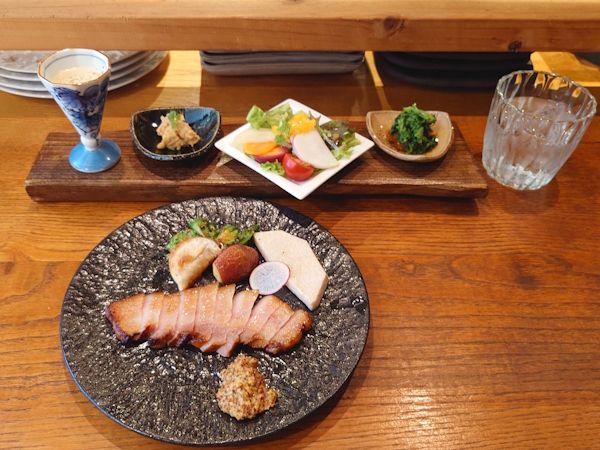 「dining陽香(hinoca)」のランチタイムは、金曜日と土曜日限定。 明るくリラックスした雰囲気の中で、おいしいランチを楽しむことができます。 ランチメニューは 旬の野菜を使った3種の小皿とスープ付の【カレーランチ】 か【陽香ランチ】 の2種類。 私は【陽香ランチ】(1650円)をお願いしました。 本日の陽香ランチのメインは四万十ポークの自家製ベーコンのステーキ・ハニーマスタードソース。 彩り豊かで丁寧に盛り付けられた料理が印象的で、素材の良さを生かしたメニューが並んでいました。