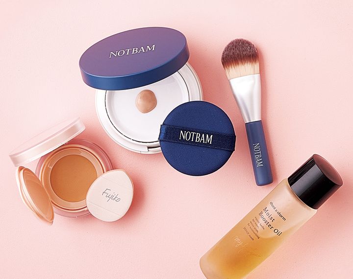 a.フジコ お直しパクト 01 ¥1,980 (かならぼ) b.NOTBAM VEGAN グロウパレットファンデーション クリアベージュ ¥8,250 (BLAIR. ) c.モイスト ブースターオイル 40ml ¥3,520 (チャントアチャーム)