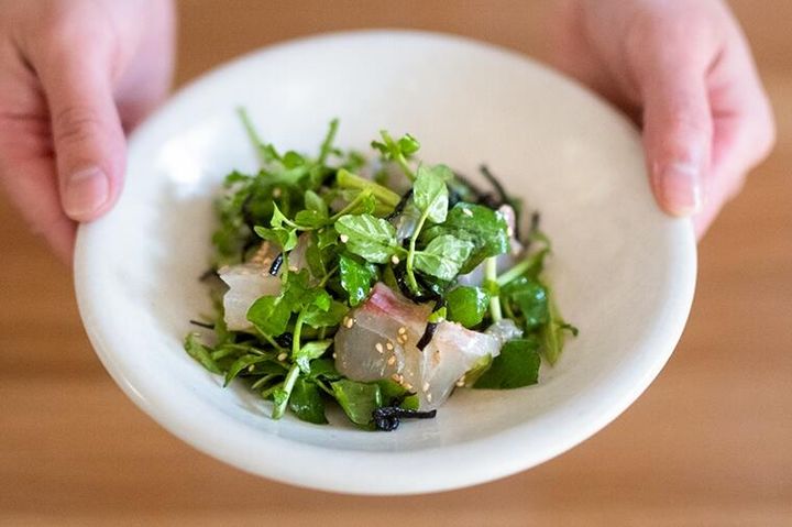 鯛の旨味とクレソンの爽やかな香りで、お酒好きに刺さる味になったと自負しています(笑)。白身魚だけでなく、いかのお刺身でつくってもおいしいです。