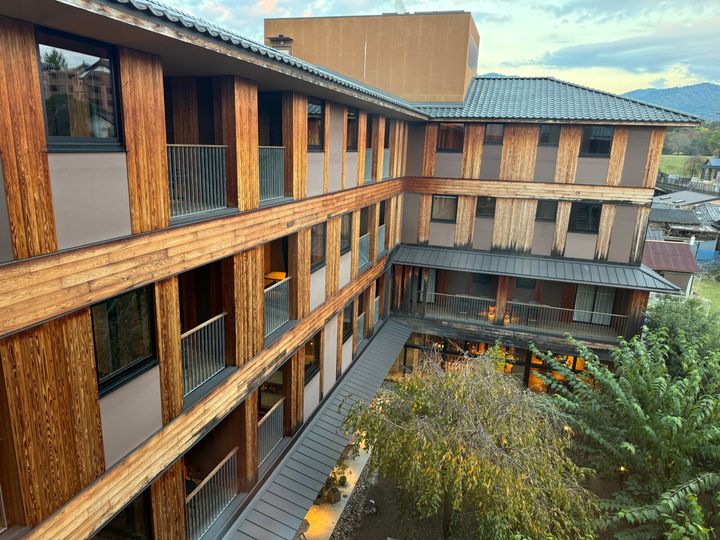 木の温もりを感じる外観や施設内の家具には奈良吉野の杉をはじめとする奈良の素材や伝統技法が使われていて、中庭にはビオヤードを備え、オーガニックの野菜やハーブを育てていて、滞在中は森林浴をしているかのような時間を過ごせます。