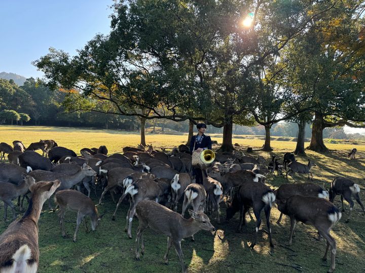 そんな奈良公園だけで体験できる貴重な体験が「鹿寄せ」です。ナチュラルホルンの音色で鹿を呼び寄せる様子は圧巻の一言。