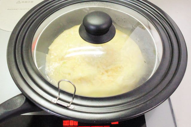 4. フライパンにサラダ油を引き、極弱火で熱します。油が熱々になったら生地を広げてフタをし、極弱火のまま、2分30秒蒸し焼きにします。