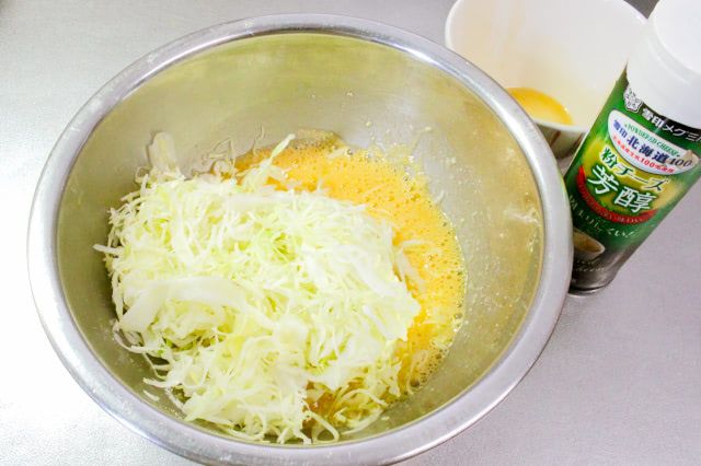 3. ボウルで卵を溶きほぐし、2と粉チーズを加えて軽く混ぜます。さらに1のキャベツも入れて、混ぜ合わせます。