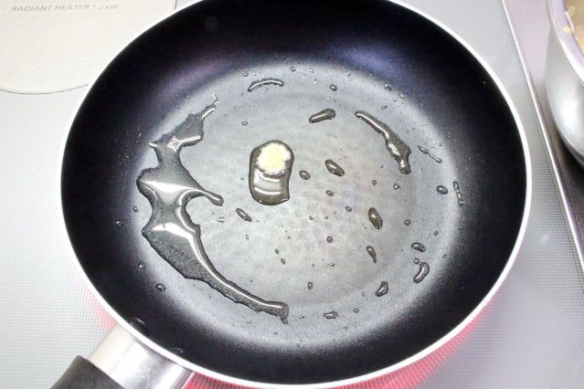 極弱火で、じっくりと油を加熱します。少量の卵液を落としてみて、ジュワッと焼けるくらいにフライパンが温まっているか、確認してから、卵液を流し入れましょう。