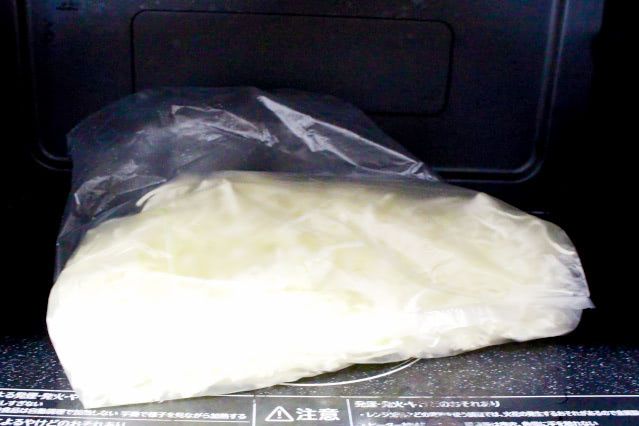 1. 耐熱性のポリ袋にキャベツを入れ、電子レンジ(600W)で1分30秒加熱します。