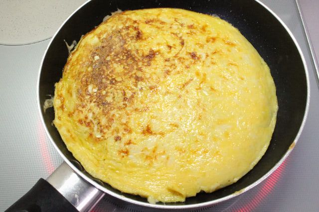 今回はIHコンロの火力2~3で、9分ほど焼いてからフタを外すと、底面が焼けて、オムレツがスルスルと動きました。