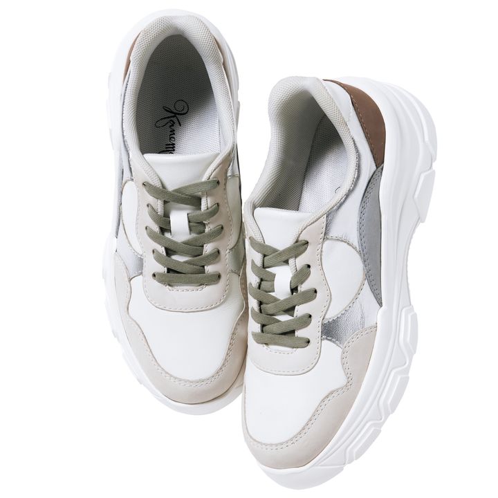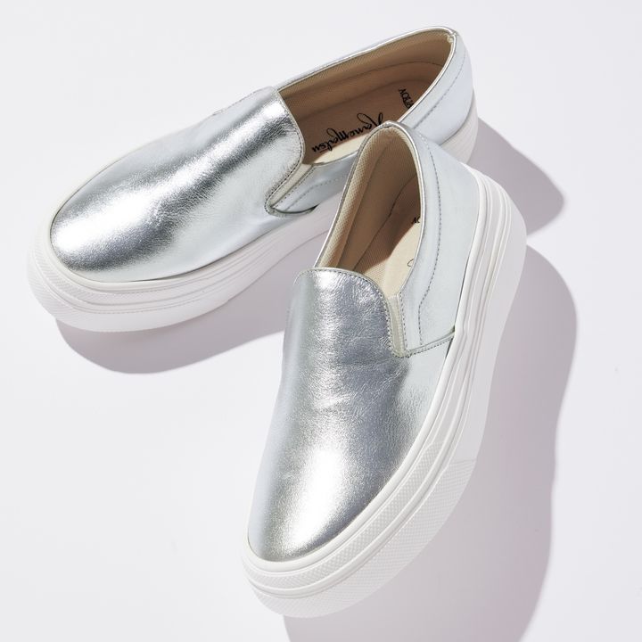 靴ひもなしのスリッポンタイプ×シルバーのコンビでモード感ある美人スニーカー