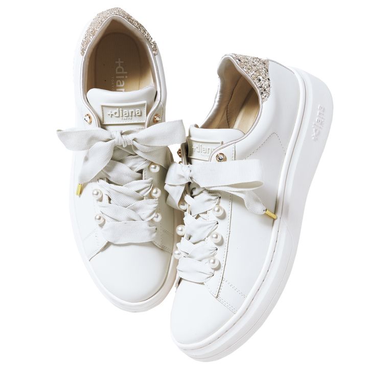 服が甘めベースな人はダイアナに入門! アクセントのパール、グリッター、グログランリボンに4cmヒールと、スタイルアップ&美人見えのてんこ盛り。スニーカー[H4cm]¥17,600(ダイアナ銀座本店)