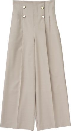 パンツはきれいめ素材を選んで、女性らしいシルエットを描くものを。ゴールドボタン付きなら品の良さも上々。