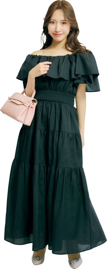 エレガントが得意なハリのある素材と大ぶりのフリルがあしらわれたワンピースをシックなブラックで取り入れることで上品見え。