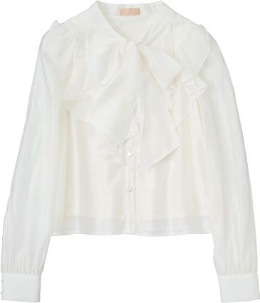 袖元や胸元にフリルやリボンなどの曲線のあるデザインでシンプルさを回避して。華感が大切なので、ディテールも盛りすぎぐらいがちょうどいい。