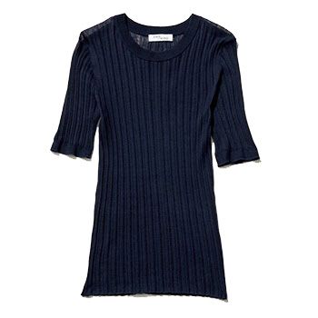 そでまでぴたっとフィットする形に、シックな濃紺。端正な形ながらどこか洒落て見えるのは、少し長めのそでのおかげ。 ネイビーハーフスリーブニット/ステートオブマインド(ゲストリスト)