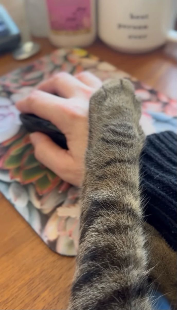 パソコンで作業する飼い主さんの手におててをのせて仕事をストップさせたネコ。 愛嬌たっぷりなお邪魔の仕方は、こちらの動画からご覧いただけます。