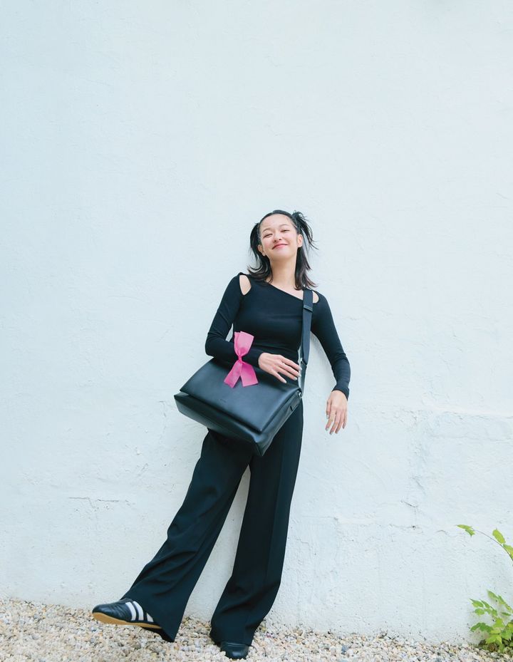 トップス¥17,600、ショルダーバッグ¥30,800/ カルバン・クライン ジーンズ(カルバン・クライン カスタマーサービス)スラックス¥17,600/コードエー(ワールド プレスインフォメーション) 腕につけたヘアゴム¥5,500/シー(エスストア) スニーカー¥15,400/アディダス(アディダス コールセンター)