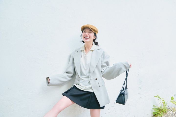 ジャケット¥29,999/H&M Studio2025年春夏コレクション(H&M カスタマーサービス)フットボールシャツ¥9,900/プーマ(プーマ お客様サービス)スカート¥13,970/スナイデル(スナイデル ルミネ新宿2店)ハンチング¥17,600/オーサムニーズ(ジャック・オブ・オール・トレーズ プレスルーム)バッグ¥13,500/チャールズ&キース (チャールズ&キース ジャパン)