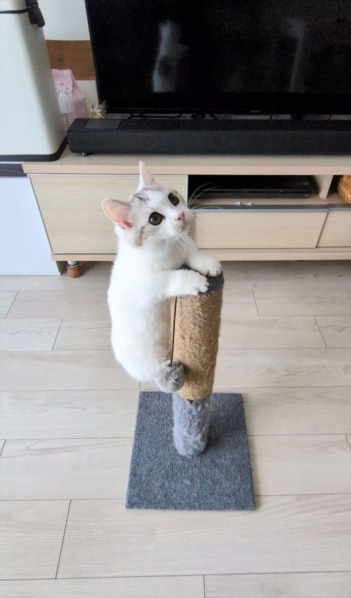 爪とぎポールへの登頂を成功させたシロップくんに、Xでは多くの反響が寄せられていました。