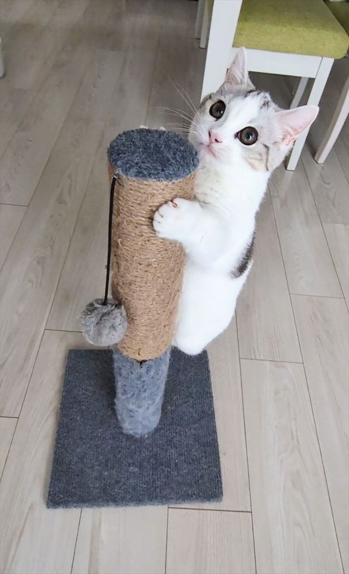 爪とぎポールによじ登ってみせた子猫。 その時飼い主さんに見せた得意げな顔が反響を呼んでいます。