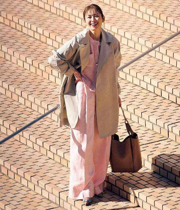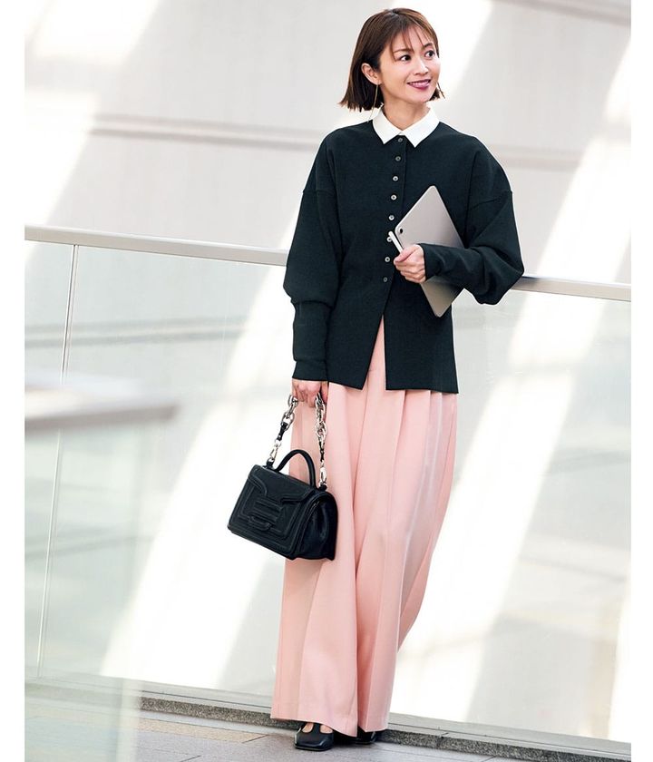 ・たまに出社する日は少しでもオシャレに見られたいから、甘ニッシュコーデと決めています。黒やグレーよりも気負いすぎないピンクのタックパンツが私にはちょうどいいんです(小山綾子さん・40歳)・イベントプランナー)