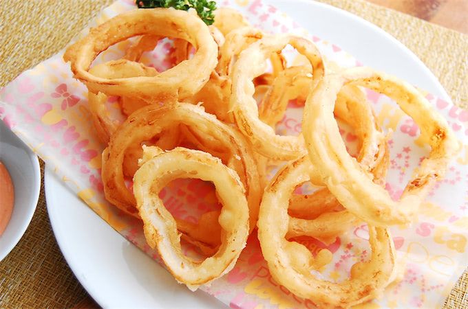 玉ねぎの薄皮を取り除き、衣にマヨネーズと炭酸水を加えることで、衣が剥がれず、時間が経ってもカリザクな食感を楽しめる、おいしいオニオンリングに仕上がりましたよ。