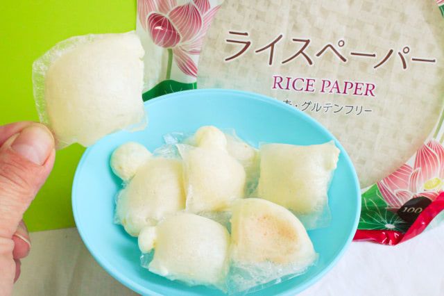 ライスペーパーを重ねた時、出来るだけ2枚を密着させるのが、きれいに作るコツ。とはいえ、ライスペーパーが硬すぎると2枚がくっつかず、戻りすぎるとペタペタとして扱いにくい…。なので、成り行き任せで仕上がった形を楽しむのがよさそうです。