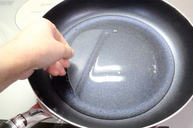 2. ライスペーパー1枚を水にサッと浸して、まな板に乗せます。