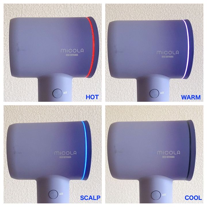 このドライヤーなんと温度設定が「HOT」「WARM」「SCALP」「COOL」の4段階も調整できるんです! 髪や頭皮のコンディション、気分に合わせて温度設定を変えたいこだわり屋さんの私にはとてもうれしい設計。暑い時期はHOTではなく、WARMやSCALPからスタートするのもよさそうだと思いました。暑がりな子どもにもおすすめです。