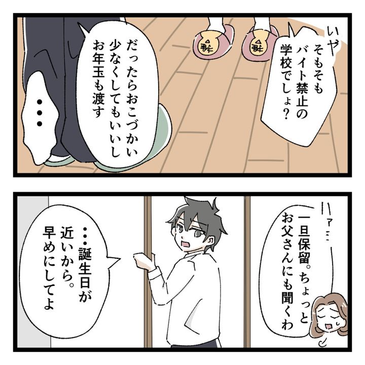 「いや、そもそもバイト禁止の学校でしょ?」お母さんの言葉に、「だったらおこづかい少なくしてもいいし、お年玉も渡す」と言われて「・・・」絶句。