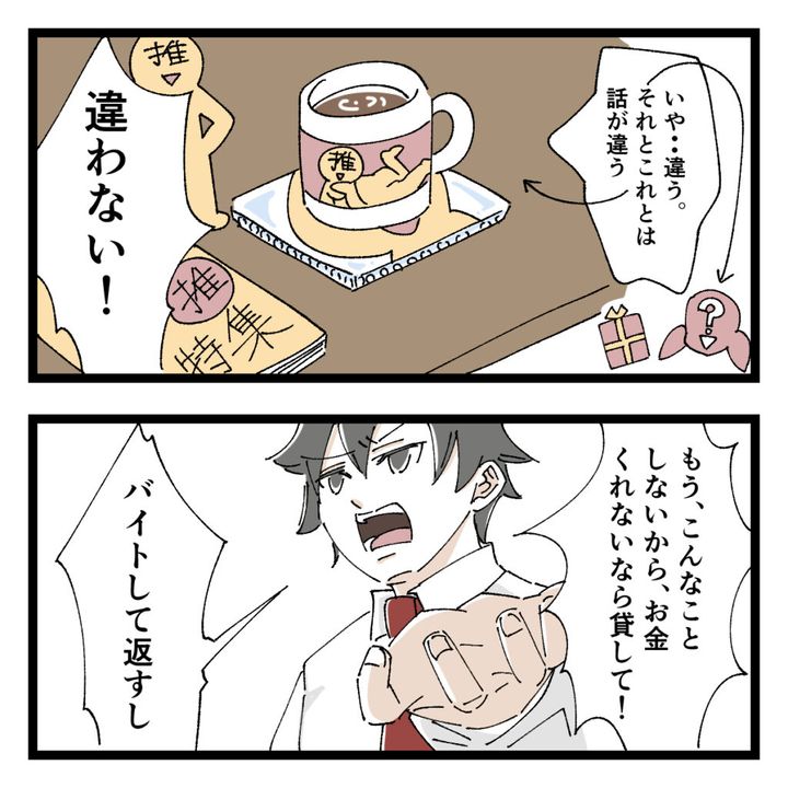 「いや・・違う。それとこれとは話が違う」と言い返すも、推しのグッズに溢れた部屋では説得力がなく、「違わない!」と簡単に否定され、「もう、こんなことしないから、お金くれないなら貸して!バイトして返すし」と強い口調で言うショウくんに、