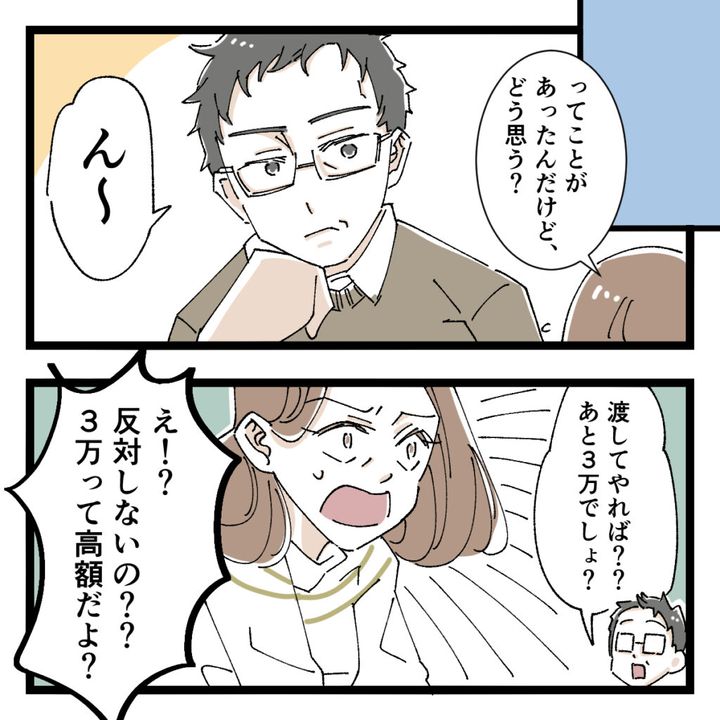 そして、「・・ってことがあったんだけど、どう思う?」お父さんに相談すると、「ん~、渡してやれば??あと3万でしょ?」あっさりそう言うお父さんに、「え!?反対しないの??3万って高額だよ?」お母さんは驚いて言いました。