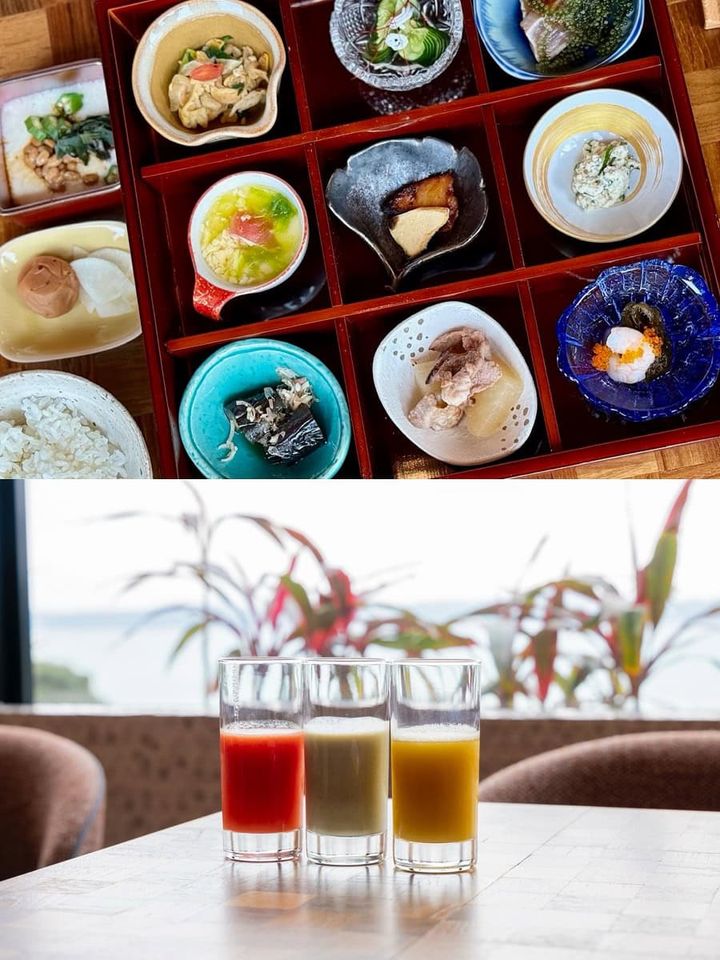 朝は洋食か和食で選べるワンプレートメニュー。今回は和食をセレクト。3種のスムージー(1種をセレクト)からはじまり、9種の豆皿、県産ステーキ、アサイーヨーグルトと盛りだくさん。