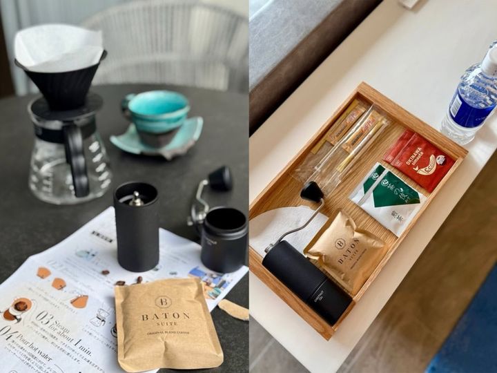 BATON SUITE オリジナルコーヒーと沖縄県産茶葉100%の島詩紅茶も完備。バルコニーで、コーヒーの香りを楽しみながらミルで挽いてのんびり過ごすのもいい。