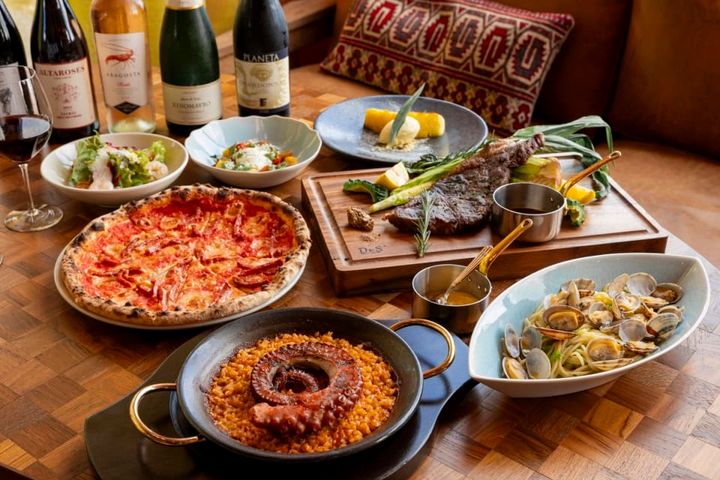 ピザや島タコのパエリアに、沖縄県産の和牛グリル……。大満足のディナーコース。どれもワインとの相性がぴったり!