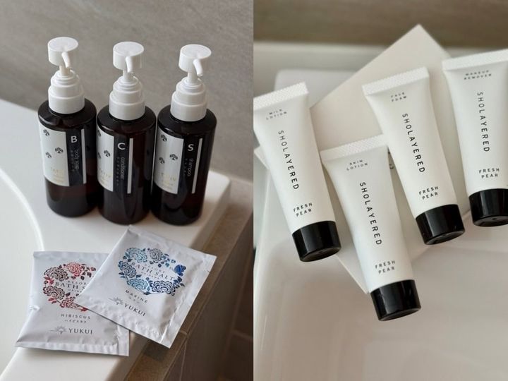 アメニティはジャパニーズフレグランスとして、大人気のショーレイヤード。クレンジング、洗顔、ローション、ミルクのチューブタイプのスキンケアセットは嬉し過ぎる。