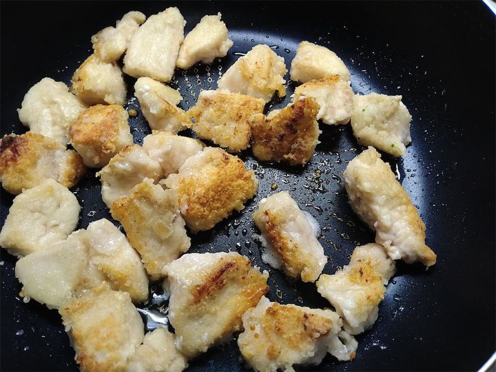 3. フライパンに油を引き、鶏肉を入れて焼く。