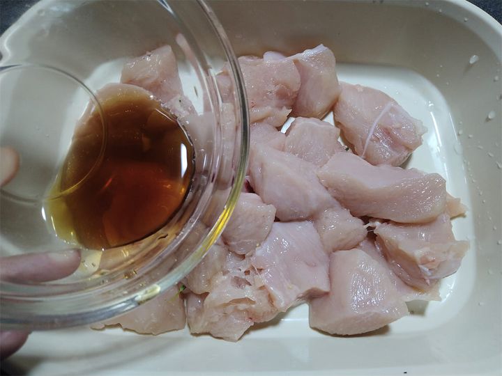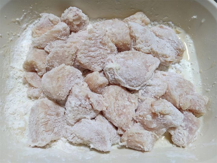 2. 鶏むね肉を食べやすい大きさに切る。めんつゆをかけて10分程度馴染ませたら、片栗粉をまんべんなくまぶす。