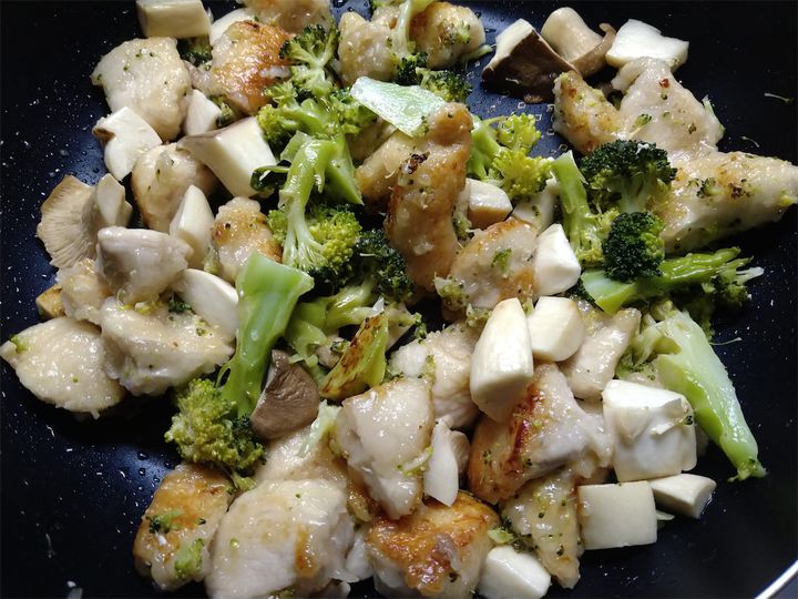6. 5のソースを4の炒めた鶏肉、ブロッコリー、エリンギとよく絡ませたら完成。