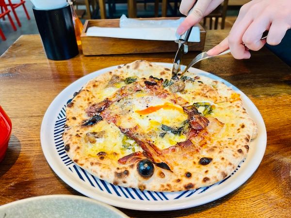 生地の加水率を69%まで高めたそう。生地の軽さともちもち感などのバランスが非常に良いことはその食感で瞬時にキャッチ。特に焼き上がり1分以内にダッシュで提供するなどやけどしそうな熱々の最初の一口で生地のサクっと食感と、とろーりチーズのエアリーな軽やかさが味わえました。