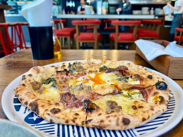平日ランチタイムに伺ってみましたが、ランチメニューがありました。白インゲン豆の入ったサラダも付いて、エアリーなピザは大きくても軽やかで一人でもサクサクっといけちゃいました。選んだのは週替わりの「ピッツァイオーロ・スペシャル」。今回は、半熟卵、ベーコン、菜の花とボリューミーな「ビスマルク」でした。一人でもスタッフの方も程よく声がけしてくださってホスピタリティも◎。