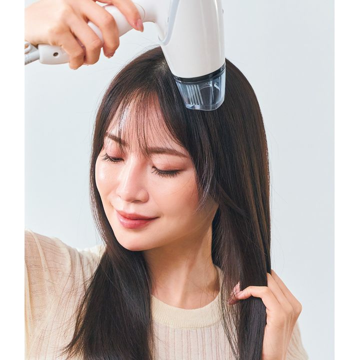 2.手ぐしで髪を下に引っ張りながら風を上から当ててハンドブロー。手ぐしを通すことでキューティクルを引き締める効果も。