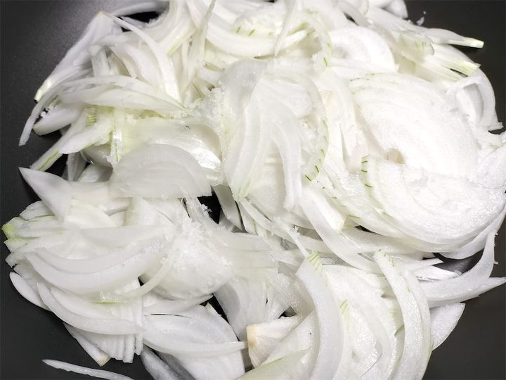1. 鍋にオリーブオイルを引いて新玉ねぎを入れ、塩をふたつまみ振って弱火でフタをして炒めます。