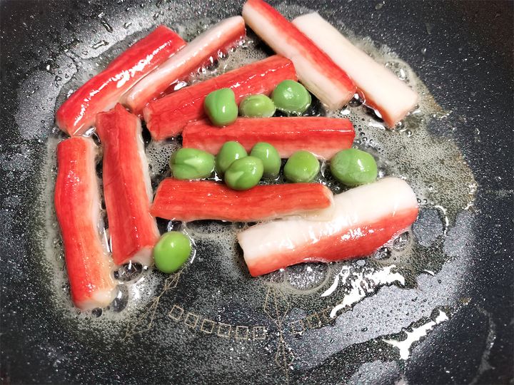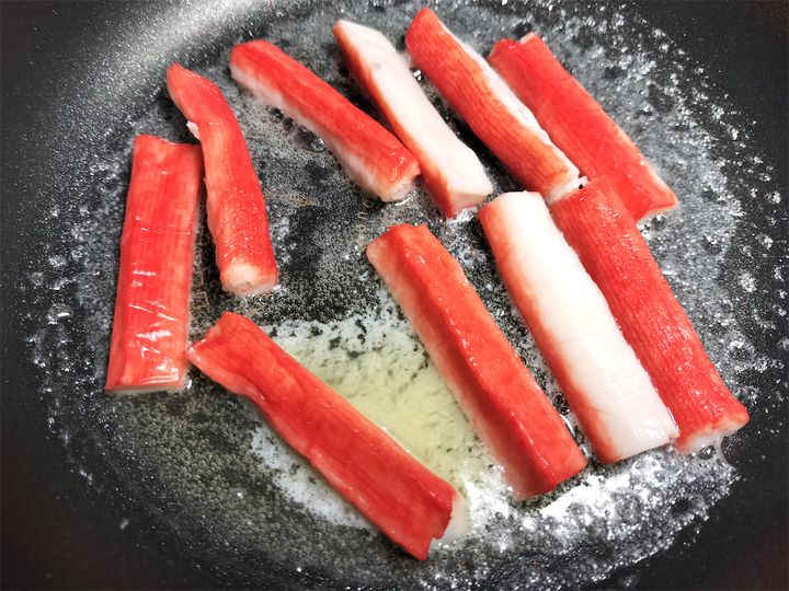 7. フライパンにバターとカニ風味かまぼこを入れ、中火で炒めます。