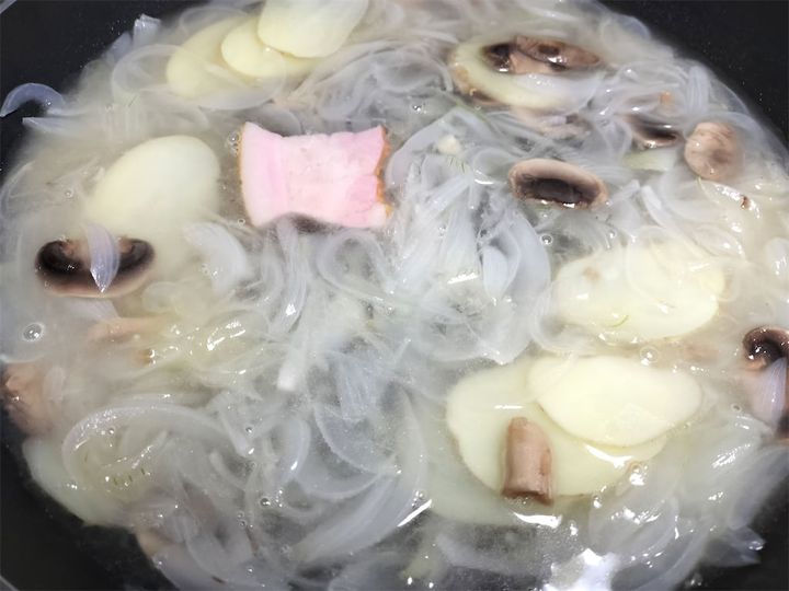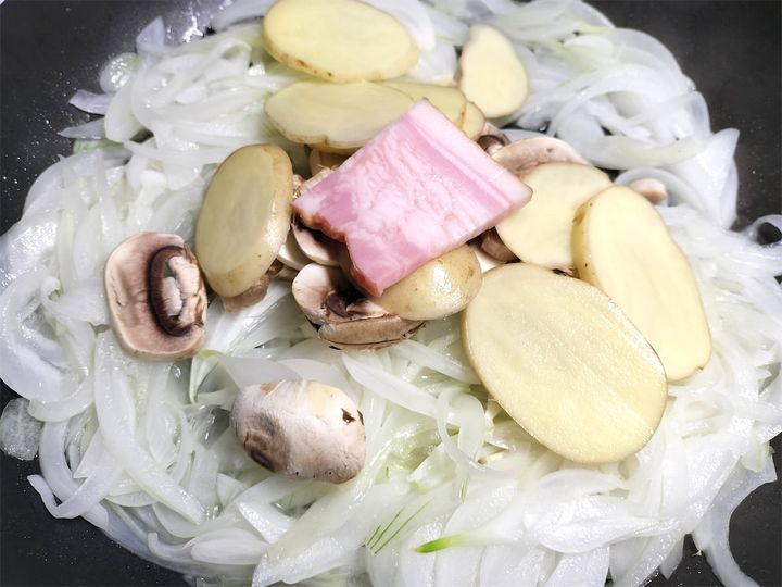 2. 新玉ねぎがしんなりしたら、マッシュルーム、じゃがいも、ベーコンを加えてフタをして炒めます。
