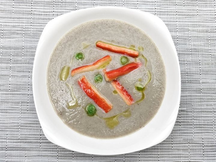 9. 6のポタージュを温めて器に盛り、8のカニ風味かまぼことグリーンピースを乗せ、オリーブオイル(分量外)を回しかけて出来上がりです。