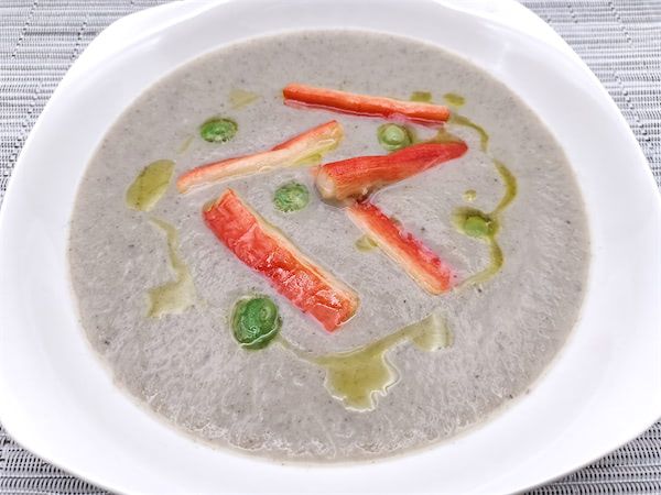 ピューレ状になった口当たりのいいポタージュを口へ運ぶと、予想を超えた新玉ねぎの甘い味が広がりました。具の2/3が新玉ねぎだということを考えれば確かに甘いと予想はつきますが、その予想を超えるとんでもない甘さです。飲み込みやすいピューレ状ですので、これなら小さいお子さんでもおいしく食べられそうです。なぜポタージュにソテーしたカニ風味かまぼこを乗せるのかと疑問でしたが、確かに大人にはこのトッピングは必要かもしれないと思うほどのよいコンビネーションでした。
