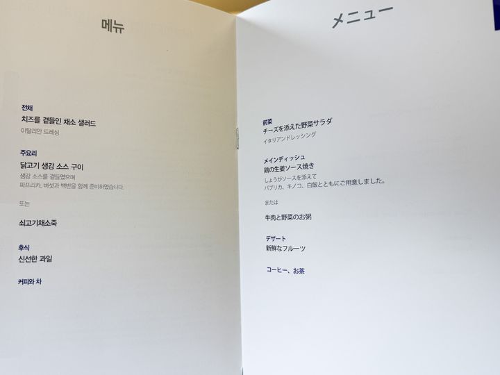 約2時間半のフライトとはいえ国際線なので、機内食がしっかりと提供されます。ビジネスクラスのメニューは2種類から選択可能。メニューは以下の通り。