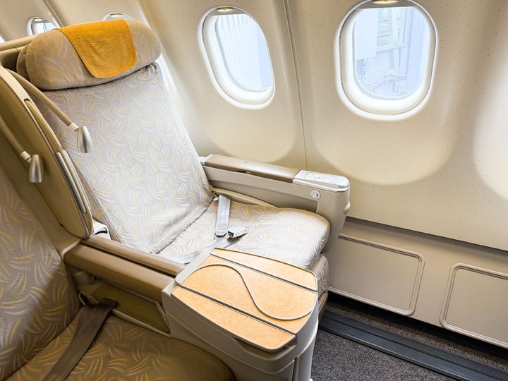 搭乗した機種はAirbus A300-300で、やや年季の入ったビジネスクラスシートが並びます。2-2-2配列で、個室感こそ少ないものの、シート自体はほぼフルフラットになるタイプです。