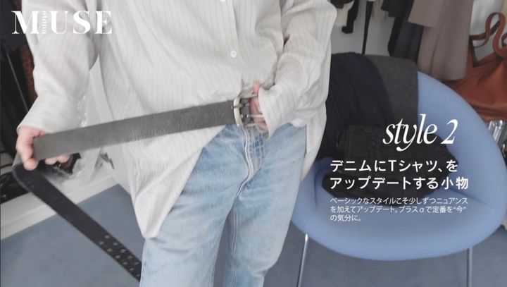 デニムにTシャツ、というシンプルなファッションが多い梨花さん。普段からよくつけているのはこちらのヴィンテージのベルト。ベーシックなスタイルだからこそ、小物でニュアンスを加えて。