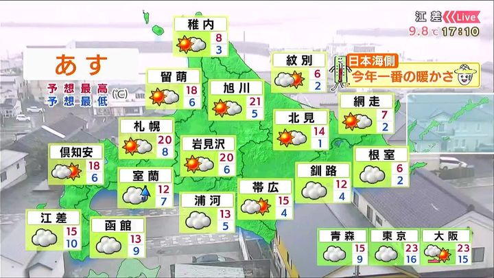 日本海側は晴れて、最高気温は札幌や岩見沢で20度、旭川は21度と今年一番の暖かさです。少し体を動かすと汗をかくほどです。オホーツク海側は晴れても寒さが戻り、太平洋側は雲が広がるでしょう。