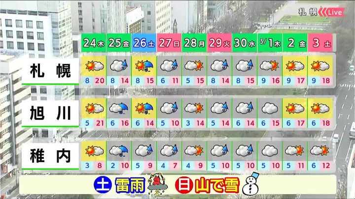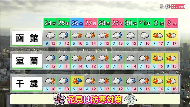 26日(土)は千歳周辺でにわか雨に注意して下さい。日曜はまずまず穏やかですが、空気がヒンヤリするため、お花見は防寒対策が必要です。