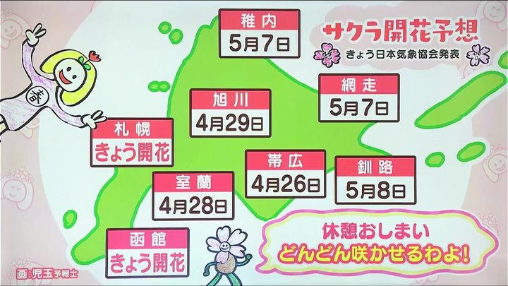 日本気象協会の最新の予想を見ると、帯広は26日(土)、室蘭は28日(月)、旭川は29日(火)です。前回の予想より全体的に遅くなっていますが、やる気になったサクラちゃんは「どんどん咲かせるわよ」と言っています。